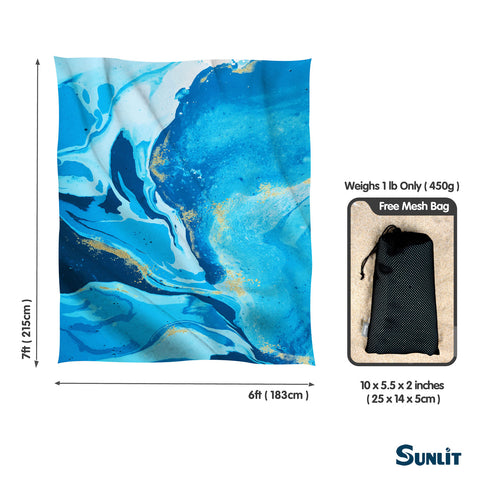 The blanket comes nicely folded in a compact 12" x 7" durable mesh bag for easy traveling and beach camping! It weighs only 1 pound.